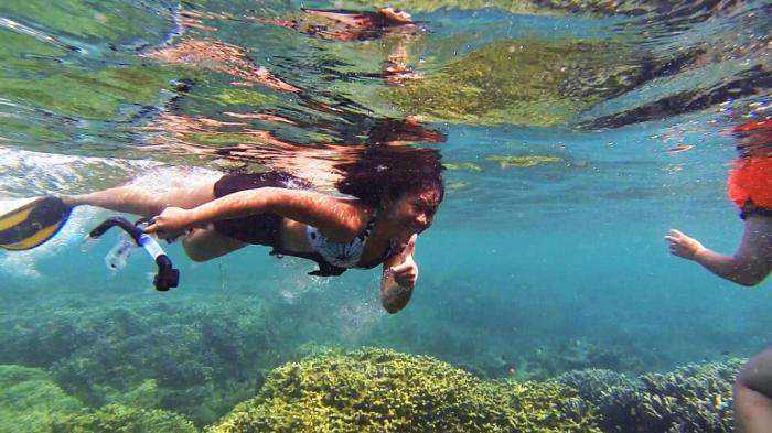 Setibanya di sana kamu akan diajak sebentar untuk menikmati keindahan biota lautnya dengan snorking bersama.