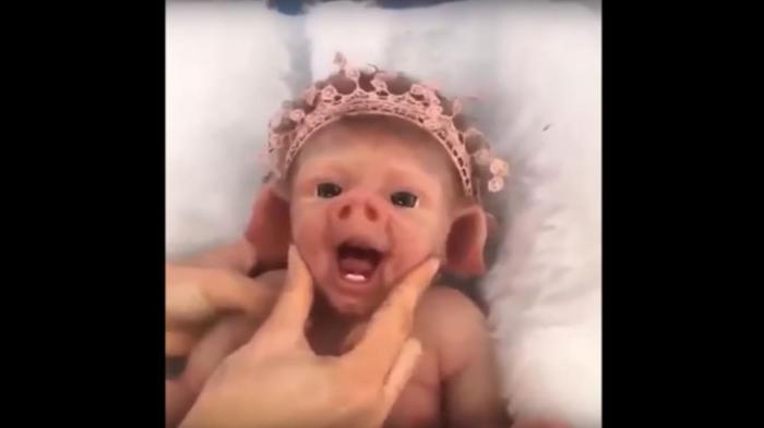 Pada video yang berdurasi 46 detik itu, terlihat tangan seorang pria memegang bayi dengan wajah yang menyerupai babi.