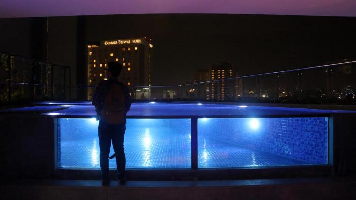 Menariknya, di lantai lima terdapat kolam renang dengan dinding kaca.