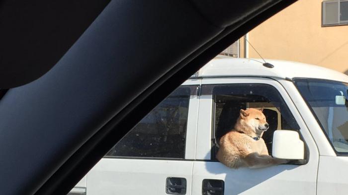 Ya, seekor anjing yang tengah duduk santai di kursi penumpang sembari menatap pintu.