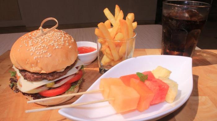 Di dalamnya terdapat beef, keju slice, dan salad. Untuk menemani burger terdapat french fries dan dua tusuk fruit salad dengan minum softdrink.