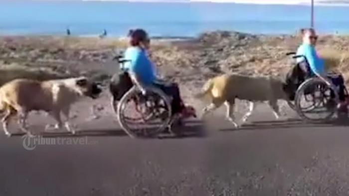 Anjing ini terlihat berlari sambil mendorong majikannya yang duduk di kursi roda di sisi jalan.