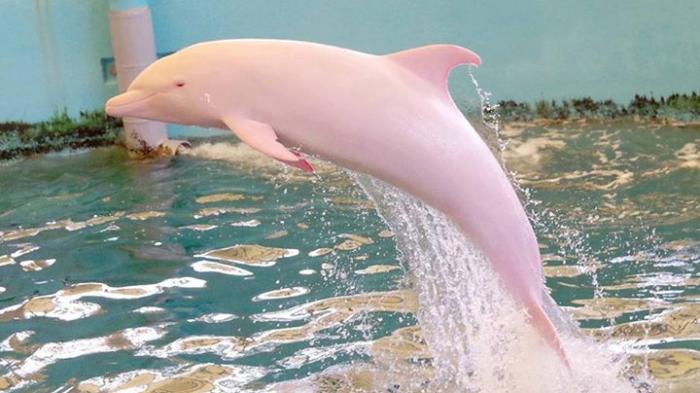Lumba-lumba langka ini diberi nama Pinky, karena kelangkaannya tersebut ia langsung populer di sana.