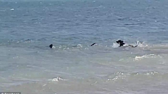 Dilansir TribunTravel.com dari laman Dailymail.co.uk, sebuah video memperlihatkan anjing yang melompat ke dalam air saat melihat hiu besar di pantai Pulau Mabuiag, Australia.