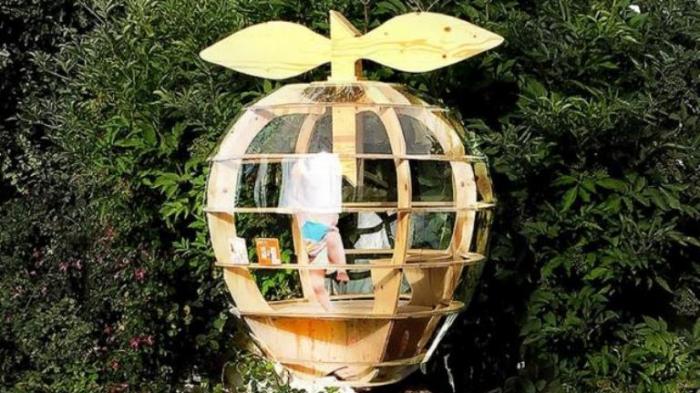 Tempat ini dibangun menggunakan dua lembar kayu lapis besar yang digergaji membentuk sebuah apel yang diselimuti polikarbonat untuk melindungi bagian atasnya.