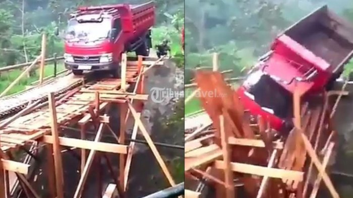 Pada video terlihat truk merah hendak menyeberangi jembatan yang dibuat dari susunan kayu-kayu.