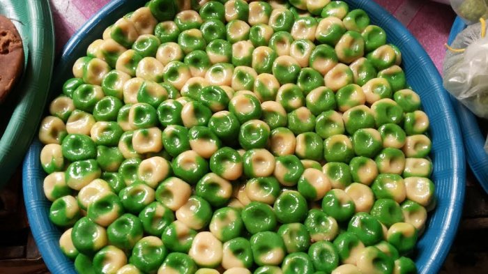 Teksturnya kenyal dan berbahan tepung yang diberi air serta pewarna alami dari daun pandan.