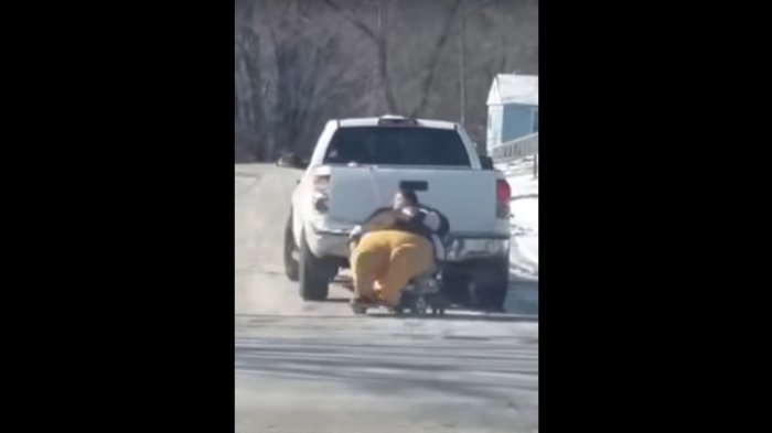 Wanita itu duduk di atas kursi beroda dan tali panjang diikat di belakang truk tersebut.