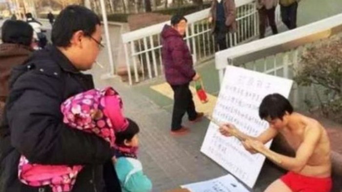 Pria yang tidak diketahui namanya ini berlutut di luar stasiun metro di pusat Kota Beijing, hanya dengan memakai celana dalam!