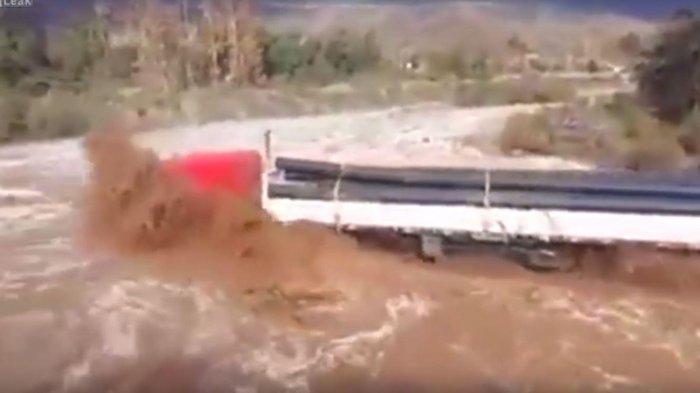 Sayangnya banjir tersebut tidak cukup menantang bagi truk roda 18 berwarna merah tersebut.