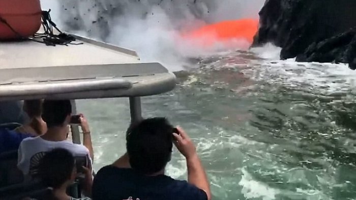 TRIBUNTRAVEL.COM - Momen ketika ratusan ton lava cair yang dimuntahkan dari gunung berapi yang mengalir ke laut berhasil tertangkap kamera turis yang menunggangi perahu yard.
