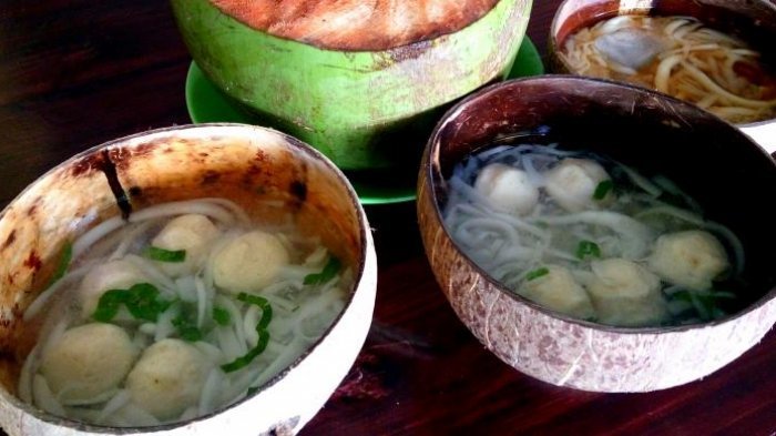Bakso, mie dan kuah degan disuguhkan dalam sebuah mangkuk yang terbuat dari batok kelapa.