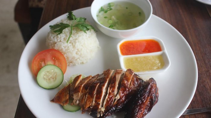 Di sini lidah akan dimanjakan oleh nikmatnya sajian ala Singapura yang terkenal dengan nama Hainan Chicken Rice.