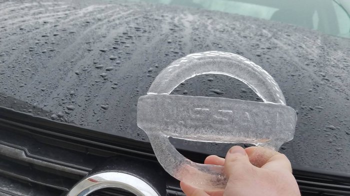 Ada ayam yang mengerami kucing, hingga logo Nisan yang terbentuk dari es.