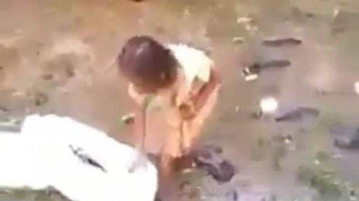 Video itu menunjukkan, seorang gadis kecil berjalan di sungai berlumpur untuk mencari barang bekas.