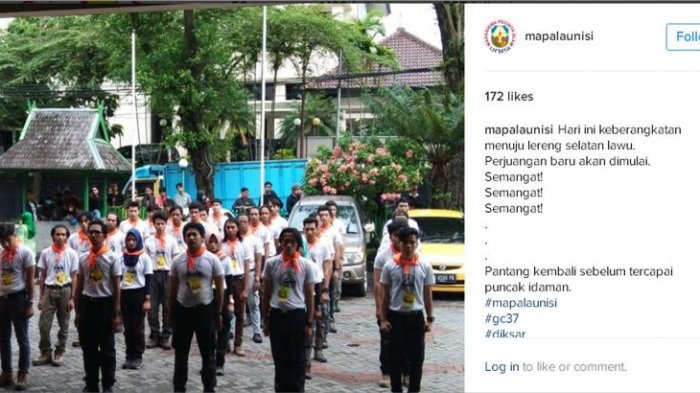 1. Pendidikan Dasar (Diksar) 37 Mahasiswa Pecinta Alam Universitas Islam Indonesia (MAPALA UNISI) UII Yogyakarta digelar Hutan Tlogodringo, Desa Gondosuli, Tawangmangu, Karanganyar, selama enam hari. Mulai Jumat-Jumat (13-20/1/2017).