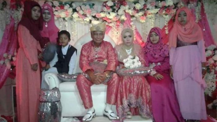 Sementara mempelai pria yang sudah tua nampak bahagia, berdampingan dengan sang istri yang masih muda di pelaminan.