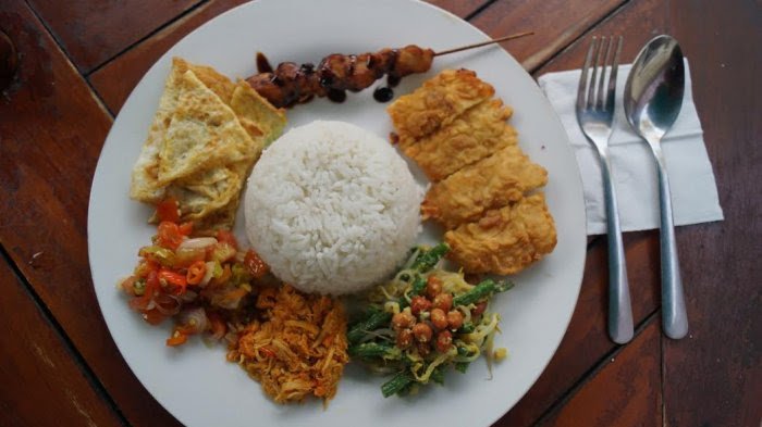 Nasi Bali yang terdiri atas satu mangkuk kecil nasi yang ditata di tengah, ikan goreng tepung, semacam urap Bali, ayam suwir bumbu cabai merah, sambal dabu-dabu, telor dadar, dan sate ayam bumbu kecap.