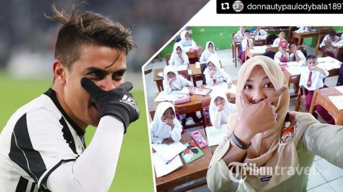 Bukan foto dirinya, melainkan seorang guru berhijab melakukan pose yang sama dengan Paulo Dybala.