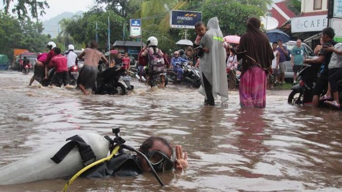Lengkap dengan perlengkapan diving, ia menyelam di Jalan Raya Singaraja-Gilimanuk, Desa Pemuteran, Kecamatan Gerokgak, Buleleng, Bali saat terendam banjir usai diguyur hujan.