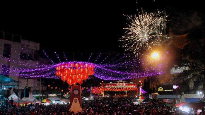 TRIBUNTRAVEL.COM, SOLO - Menyambut Tahun Baru Imlek, pesta kembang api diadakan di halaman Balai Kota Surakarta, Sabtu (28/1/2017).