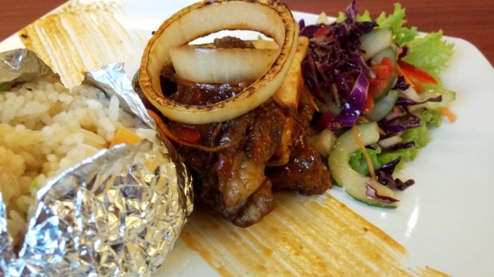 Spesial Iga Sapi yang dibakar pada grill dan dilumuri dengan bumbu BBQ, tersaji nikmat dengan butter rice dan fresh salad.