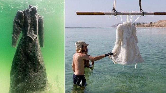 Nah, dari cerita ini seniman Sigalit Landau mencoba meninggalkan gaun hitam di dalam laut mati.