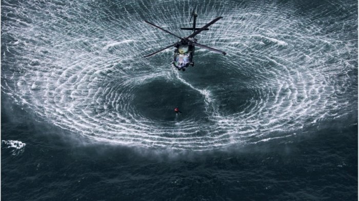 8. Helikopter yang mendekati permukaan air, nampak seperti membentu pusaran.