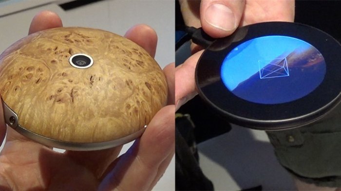 Ponsel berbentuk melingkar ini memiliki layar di depan, kamera di bagian belakang dan fitur pendukung lainnya.