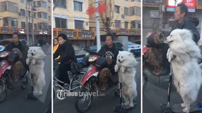 Anjing samoyed berwarna putih itu tampah tenang mengendarai skuter, dengan kedua kaki depan untuk mengarahkan stang, sedangkan dua kaki belakang untuk berdiri.