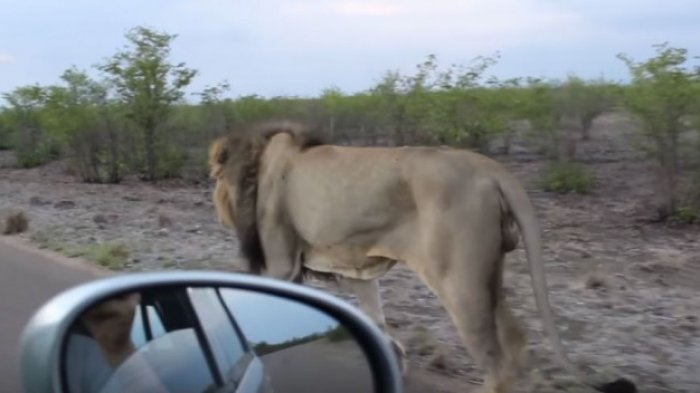 Kejadian tersebut bermula ketika seekor singa dewasa berjalan, dan sebuah mobil mengikuti di belakangnya.
