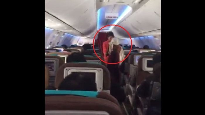Tampak, sang pramugari dengan sabar berjalan mundur sambil mengarahkan sang nenek menuju bagian depan kabin.