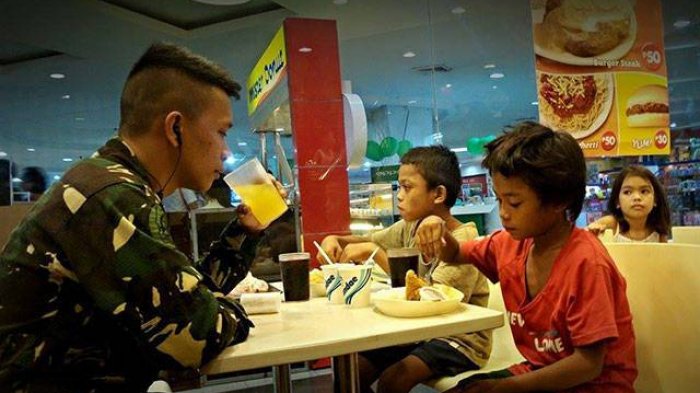 10. Tentara asal Filipina ini mengajak dua anak jalanan untuk makan bersama.