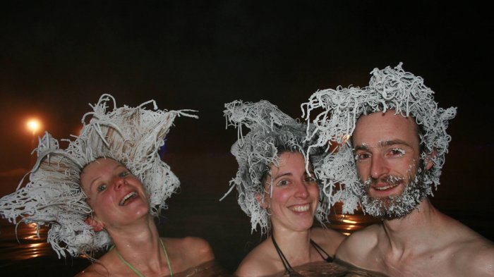 Para peserta berendam di air panas dan mulai membekukan rambut.