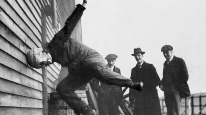 14. Momen ini terabadikan saat tes uji coba helm rugby, 1912.