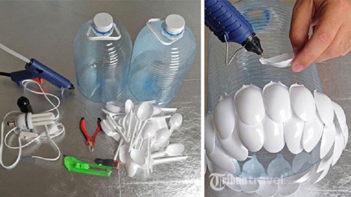Sendok plastik yang sudah terkumpul tinggal potong dan dilem mengelilingi galon ukuran sedang.