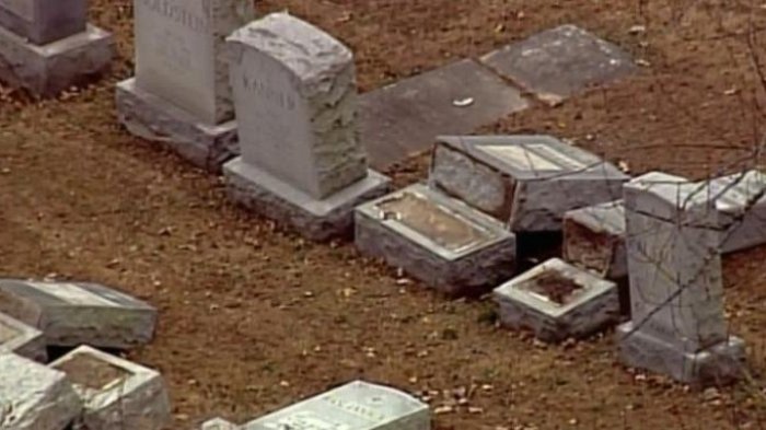 Lebih dari 100 batu nisan dirusak di pemakamam Chesed Shel Emeth yang berusia 123 tahun di Missouri, AS.