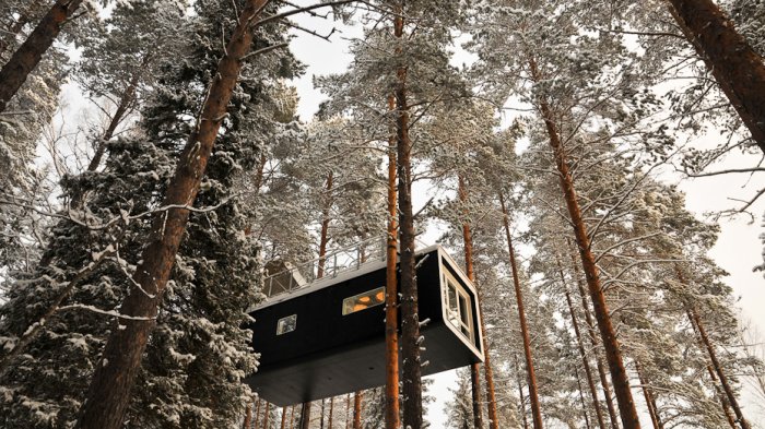 Treehotel yang berada di tengah hutan wilayah Harads, Swedia ini, menggantung di atas pohon dengan ketinggian empat hingga enam meter.