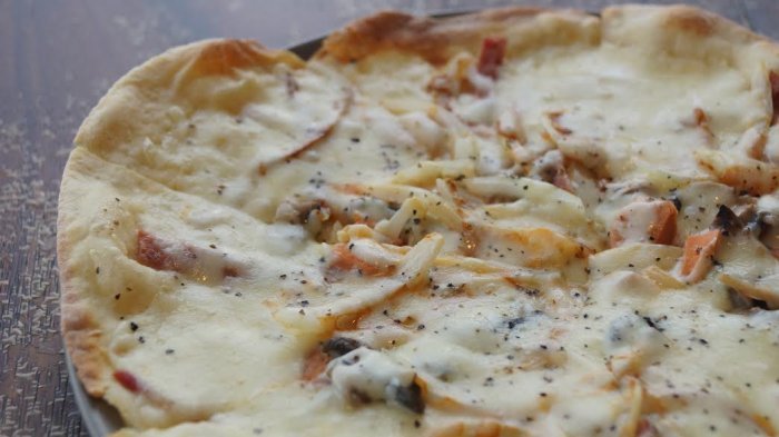 Keju mozzarella yang melimpah membuat pizza ini terlihat sangat penuh, namun adonan pizza yang digunakan sangat tipis dan renyah.