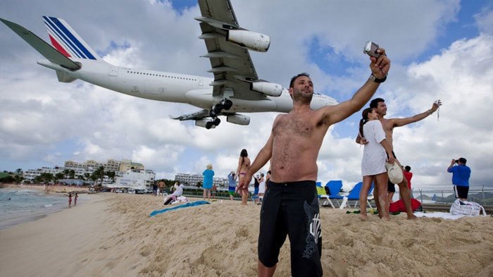 Guys, kalau cuma di Saint Martin, kamu bisa selfie berasama pesawat yang landing sekaligus background pantai.