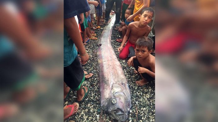 TRIBUNTRAVEL.COM - Ikan oarfish sepanjang 15 meter yang biasanya hidup di dasar laut dalam, ditemukan terdampar di perairan Pantai Cagayan de Oro, Mindanao, Filipina pada Sabtu (18/2/2017) pekan kemarin.