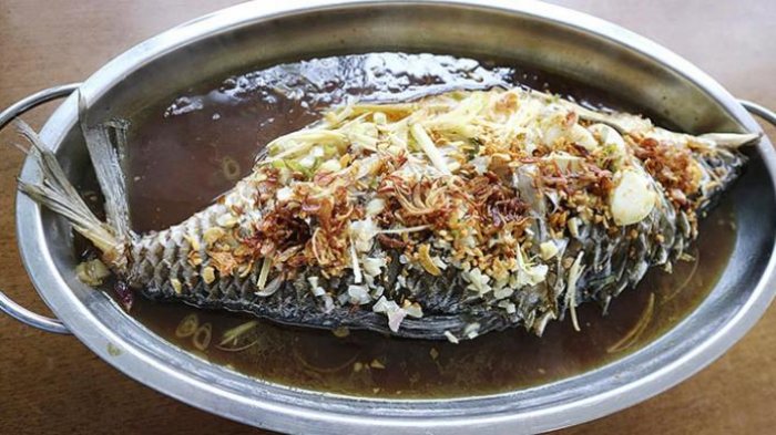 Harum bawang putih, serai, dan jahe menyeruak bersama datangnya seporsi ikan tim.