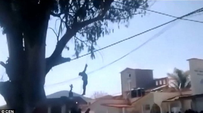 Warga kemudian menangkap pria itu dan memukulinya, lalu menggantungnya di pohon yang tinggi dengan kedua pergelangan tangan berada di balik punggungnya.