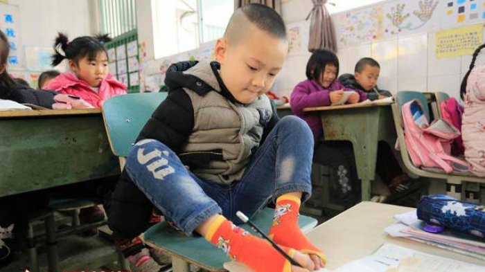 Ya, Jiang memang tidak memiliki lengan, namun kekurangan itu tak menjadikannya putus asa untuk menempuh pendidikan.