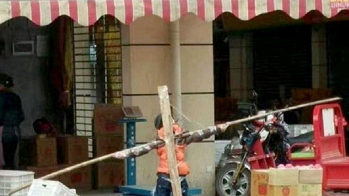 Seorang ayah mengikat anaknya menyerupai posisi salip di jalanan, karena sang anak menolak untuk mengerjakan pekerjaan rumahnya.