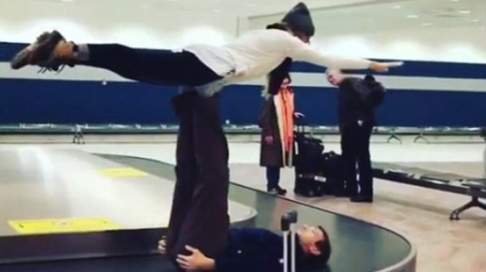 Dalam foto yang dilansir TribunTravel.com dari laman DailyMail.co.uk ini ada yang menunjukkan gambar seorang wanita dan pria sekaan sedang atraksi di bagasi bandara.