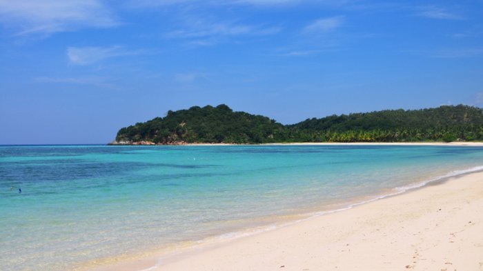 Pasirnya putih bak kristal, air lautnya jernih, bersih dan membiru.