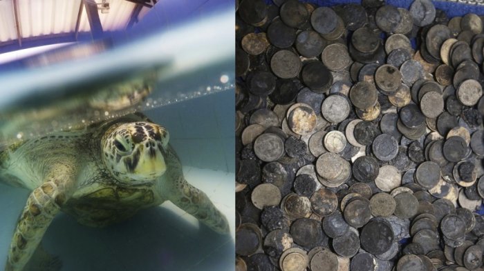 Koin yang memberatkan tubuhnya membuat cangkang bagian bawahnya retak dan menyebabkan infeksi yang mengancam jiwanya.