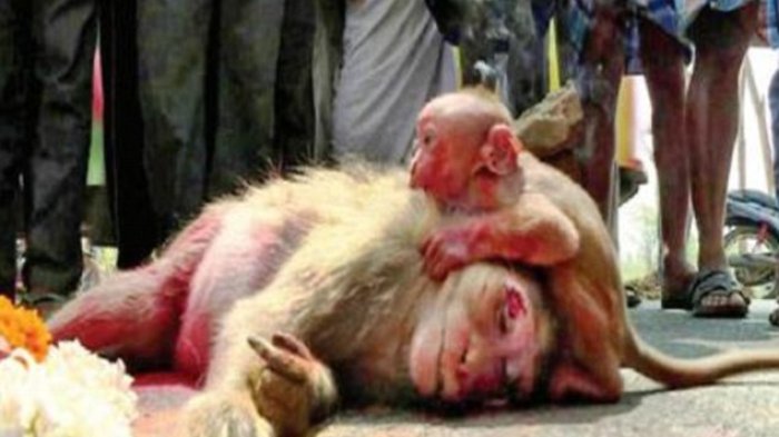 Ibu monyet itu tertabrak oleh mobil yang melaju ketika sedang menyeberang jalan di India selatan.
