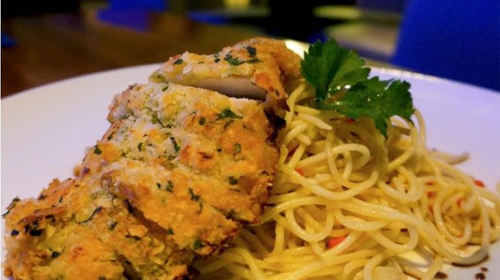 Spaghetti aglio yang disajikan dengan dada ayam yang telah dilumuri dengan bumbu rempah- rempah dan dibalut dengan tepung roti dan keju, kemudian dipanggang.